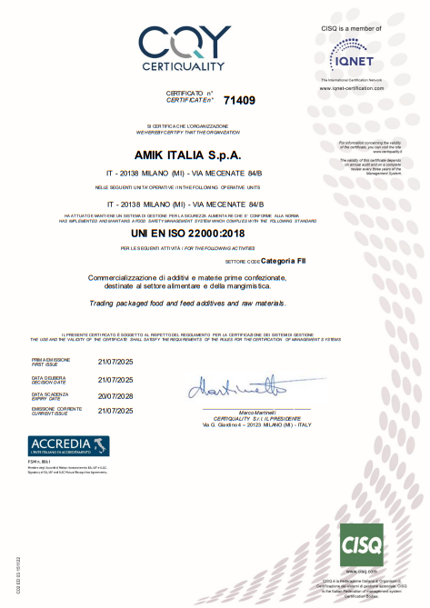 Amik Italia S.p.A., Milano merkezli köklü bir kimya ve kozmetik hammaddeleri üretim–dağıtım firmasıdır; 1976’dan bu yana endüstriyel kimyasalların yanı sıra saç ve cilt bakımına yönelik profesyonel çözümler geliştirerek uluslararası pazarda güçlü bir konuma ulaşmış, Amik Cosmetics markası altında saç boyaları için pigmentler ve cilt bakımında yenilikçi içerikler sunmuş, sürdürülebilirlik ve kalite odaklı üretim anlayışıyla çevre dostu formüller geliştirmiş, Endüstri 4.0 uyumlu modern tesislerinde global ticaret ağıyla 20’den fazla ülkede faaliyet göstererek güvenilir ve yenilikçi bir tedarikçi olarak öne çıkmıştır.