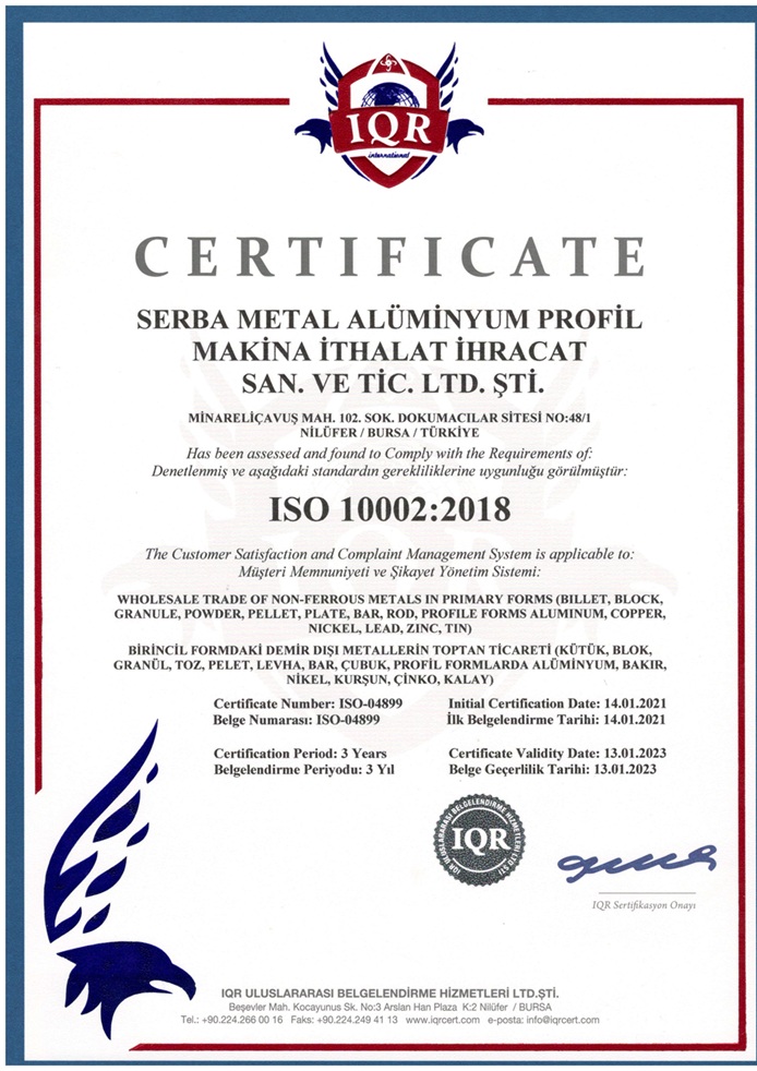 Serba Metal Alüminyum Profil İth. İhr. Ltd. Şti., Bursa Nilüfer Organize Sanayi Bölgesi’nde faaliyet gösteren, alüminyum, galvaniz, paslanmaz ve boyalı sac ürünleri konusunda uzmanlaşmış köklü bir Türk firmasıdır. Sanayi ve inşaat sektörlerine yönelik geniş ürün yelpazesiyle dikkat çeken firma; alüminyum profil, levha, rulo, çeta ve trapez gibi malzemelerin yanı sıra, galvaniz ve paslanmaz sac çözümleri de sunmaktadır. Üretim süreçlerinde lazer kesim, apkant kesim-büküm, punch kesim, rulo dilme, ebatlama ve sac yüzeyi folyo kaplama gibi teknik hizmetler sağlayan Serba Metal, ISO 9001:2008 ve TSE belgeleriyle kalite standartlarını belgelendirmiştir. Hem iç pazarda hem de ihracat alanında aktif olan firma, müşteri odaklı yaklaşımı ve güçlü teknik altyapısıyla sektörde güvenilir bir çözüm ortağı olarak öne çıkmaktadır.