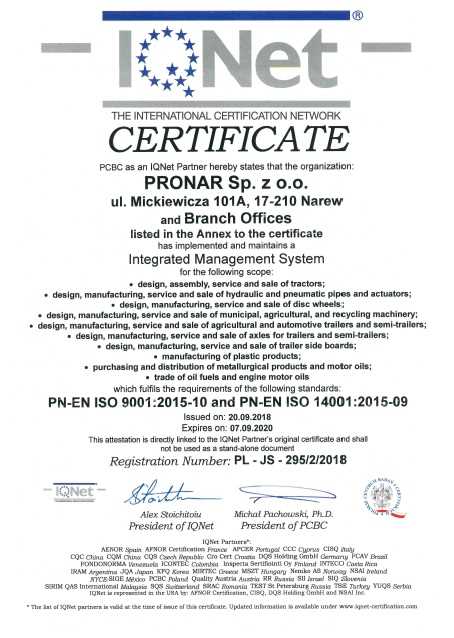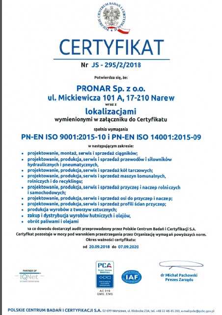 "Pro" يعني الإنتاج ، "الرمان" هو اختصار Narew - وبالتالي اسم الشركة.Pronar يستأجر أكثر من 2000 موظف.في 7 مصانع حديثة تضم 80 فيلد كرة قدم ، يتم استخدام 600 طن لإنتاج 600 طن من الصلب اليومي في الوقت الحاضر ، وهي بلا منازع في إنتاج وبيع الآلات والمعدات من أجل الزراعة والخدمات البلدية وتصنيع صناعة النقل مع حوالي 50 ٪ في السوق في السوق في السوق البولندية.يعد Pronar أيضًا أكبر لاعب في العالم بين عجلات الآلات الزراعية والبلدية ، والأنظمة الهوائية والهيدروليكية ، ومحاور المقطورة ، وملامح الصلب والمكونات البلاستيكية.على مر السنين ، صنعت Narew آلات ومعدات تنافسية من أكثر الآلات والمعدات تنافسية لالتزام Narew والابتكار والحداثة وأعلى جودة.أنشأت الشركة شبكة الوكلاء في جميع دول الاتحاد الأوروبي ، الدول الاسكندنافية وروسيا.يتم تصدير منتجات Pronar إلى أكثر من 60 دولة بما في ذلك أفريقيا ونيوزيلندا وأستراليا ، وكذلك إفريقيا.